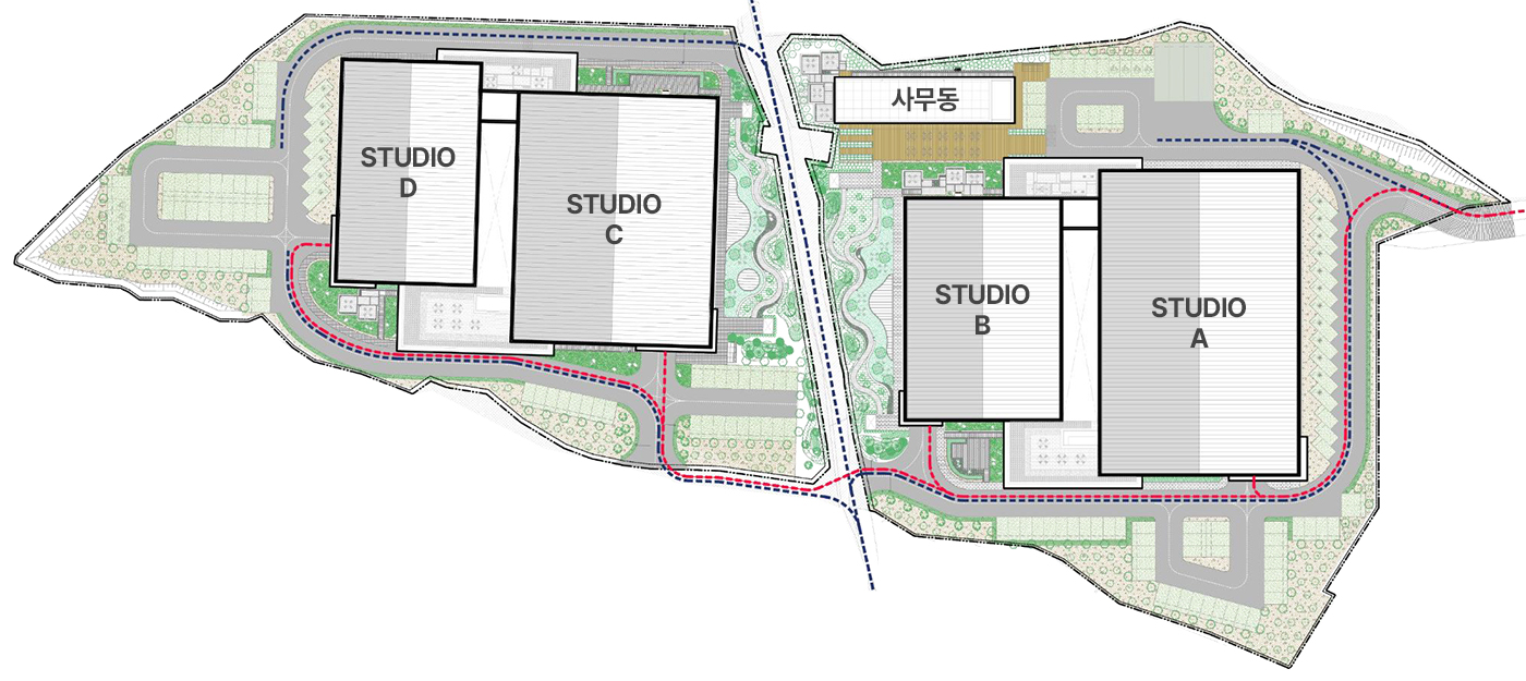 4개동의 스튜디오로 구성되어 있으며 면적은 스튜디오 전용 + 부대시설 면적 기준입니다.