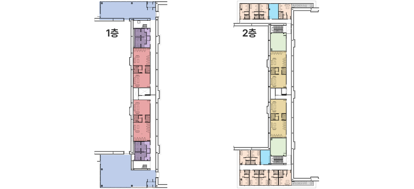 스튜디오별로 VIP 대기실 4개소(1층 2개소, 2층 2개소)와 개인 대기실 4~7개소, 의상실 1개소, 회의실 1개소, 다목적 공간 1개소가 마련되어 있습니다.